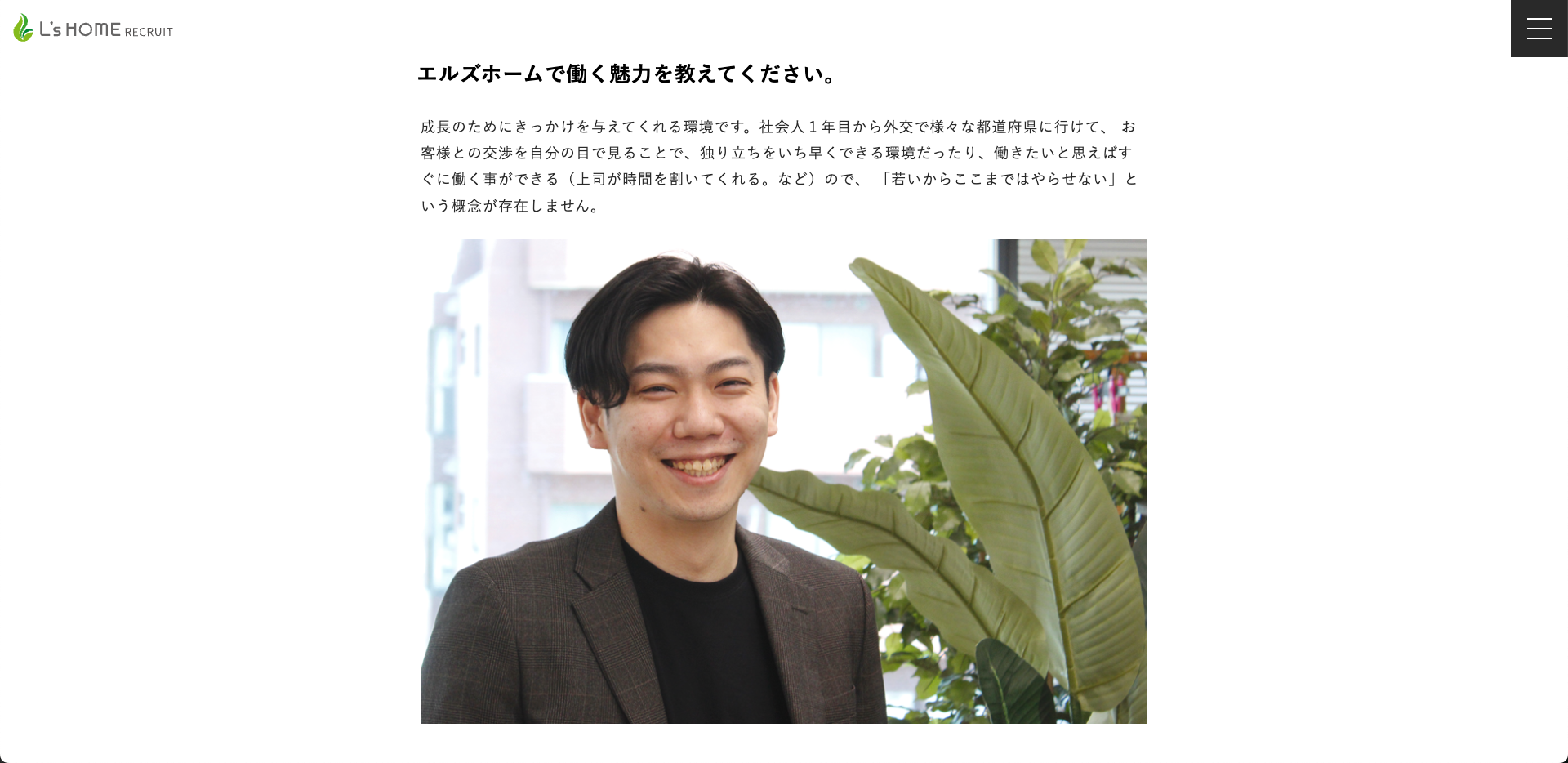 不動産会社のリクルートサイトですが、あまり暑苦しい印象を与えず、 求職者様の不安を減らす情報設計と導線設計で情報処理にストレスのかからないよう、 サイトのトーンや雰囲気にも注意しました。サイトの目的は老若男女問わず幅広いユーザーに応募してもらうことでしたので、 実際にサイト公開からのリード獲得が達成できており、大手人材紹介サイトに負けない強みを出せたと感じております。