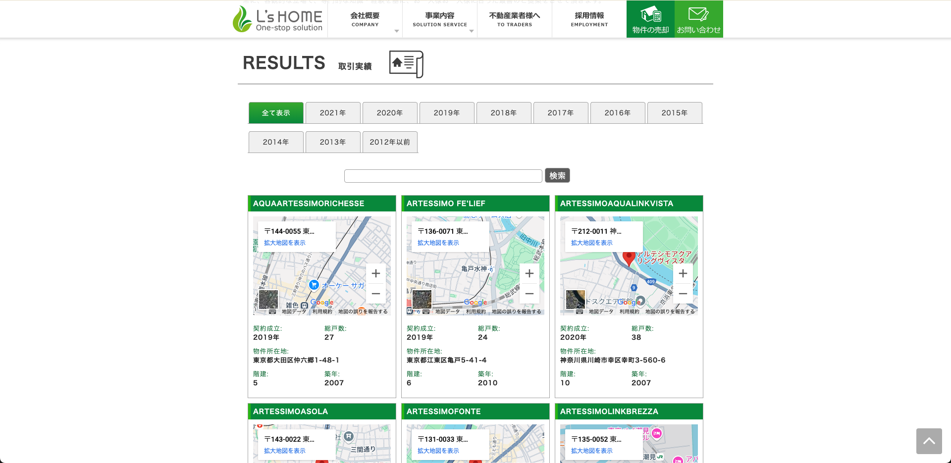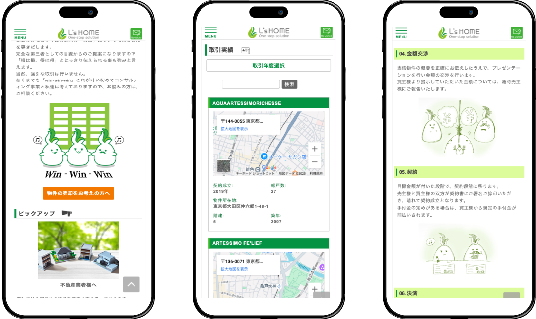 ブランドイメージを意識し、不動産会社としての信頼感を視覚的に表現しました。 ファーストビューは動画や画像ではなく「読みやすさ」を重視したタイポグラフィで構成し、離脱を防ぎつつ信頼感を強調しています。 トーンの一貫性と余白のバランスにこだわり、ユーザー層であるやマンション購入者やお取引き企業様が情報をスムーズに得られるよう、 シンプルかつ導線の明確なUI設計を行っています。